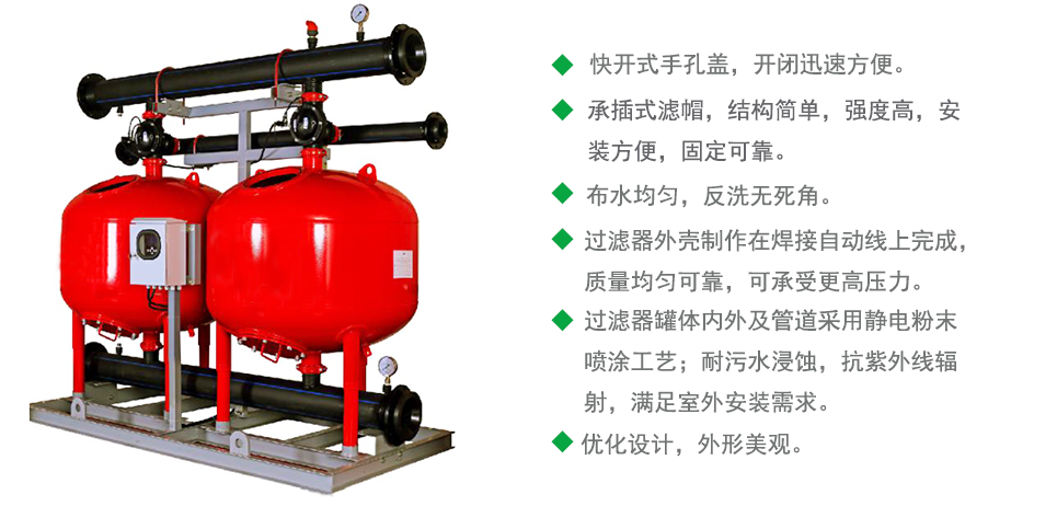 應(yīng)用領(lǐng)域:石英砂過濾器適應(yīng)于蔬菜、果樹、溫室、花卉、茶園、綠地及大田各類農(nóng)作物的灌溉