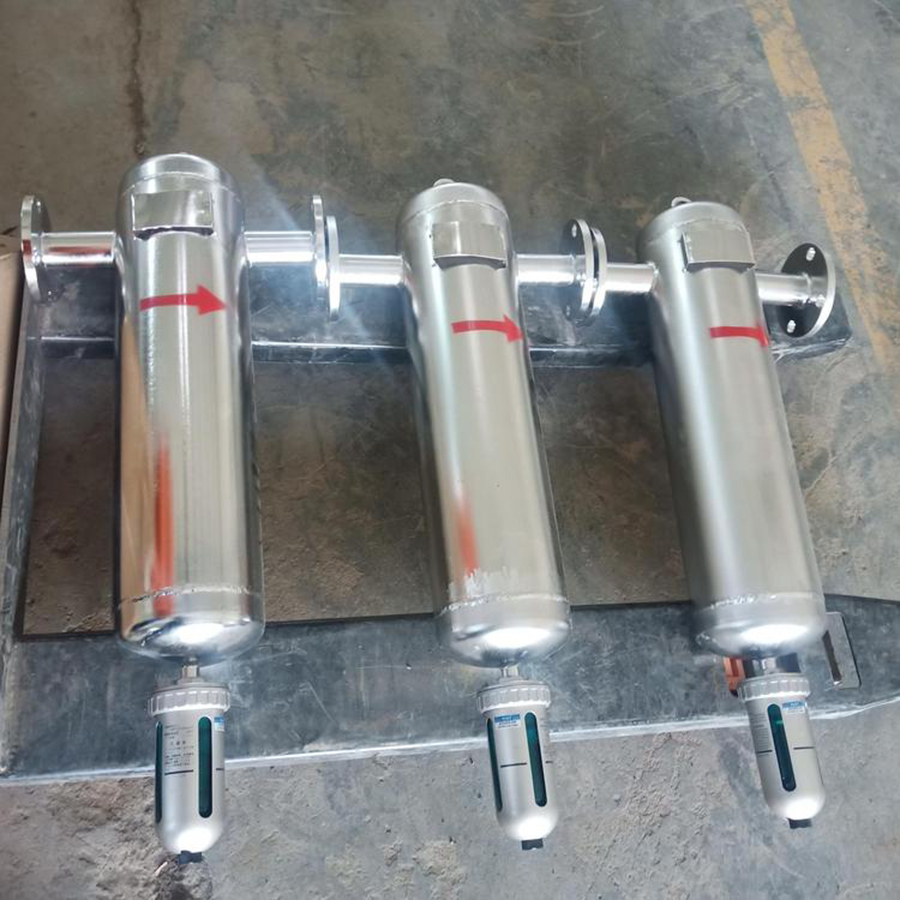 應(yīng)用領(lǐng)域:濾芯式是可以除水,除雜,除油的,一般常用于空壓機配套使用?;蛘吣臍怏w中如果含雜質(zhì)含水并且對過濾效率要求高的也可以選擇濾芯式汽水分離器。