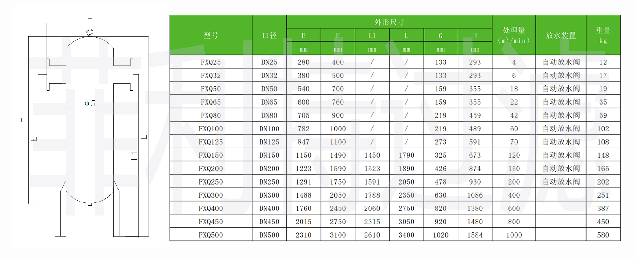FXQ系列汽水分離器為壓力容器結(jié)構(gòu)的碳鋼或不銹鋼設(shè)備,目的是除去不能通過疏水閥排掉的懸浮在蒸汽中的水分。汽水分離器必須安裝于水平管線上,排水口垂直向下,為確保被分離的液體迅速排放,應(yīng)在汽水分離器底部的排水口連接合適的一套疏水閥組合。