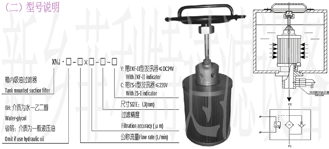 XNJ系列箱內(nèi)吸油過濾器具有以下特點(diǎn):a.安裝連接方便:本系列吸油過濾器通過安裝法蘭固定在油箱的蓋板上,濾芯直接插入油箱,從而簡化了系統(tǒng)的管路,節(jié)省空間,使系統(tǒng)布置更緊湊。B.清洗或更換濾芯時(shí),只要擰開安裝法蘭上的螺釘、拉起安裝法蘭,即可清洗或更換。C.帶有濾芯堵塞發(fā)訊裝置:當(dāng)濾芯被污染物堵塞到真空壓力為-0.018MPa時(shí),發(fā)訊器發(fā)出開關(guān)信號(hào)(用戶外接電信號(hào)),這時(shí)應(yīng)及時(shí)更換或清洗濾芯,以免油泵出現(xiàn)吸空等故障。d.帶有旁通閥:當(dāng)濾芯被污染物堵塞到真空壓力為-0.018MPa時(shí),此時(shí)如不能馬上停機(jī)清洗或更換濾芯,裝在濾芯上端的旁通閥會(huì)自動(dòng)開啟(開啟壓力為-0.02MPa),以保護(hù)油泵正常工作。