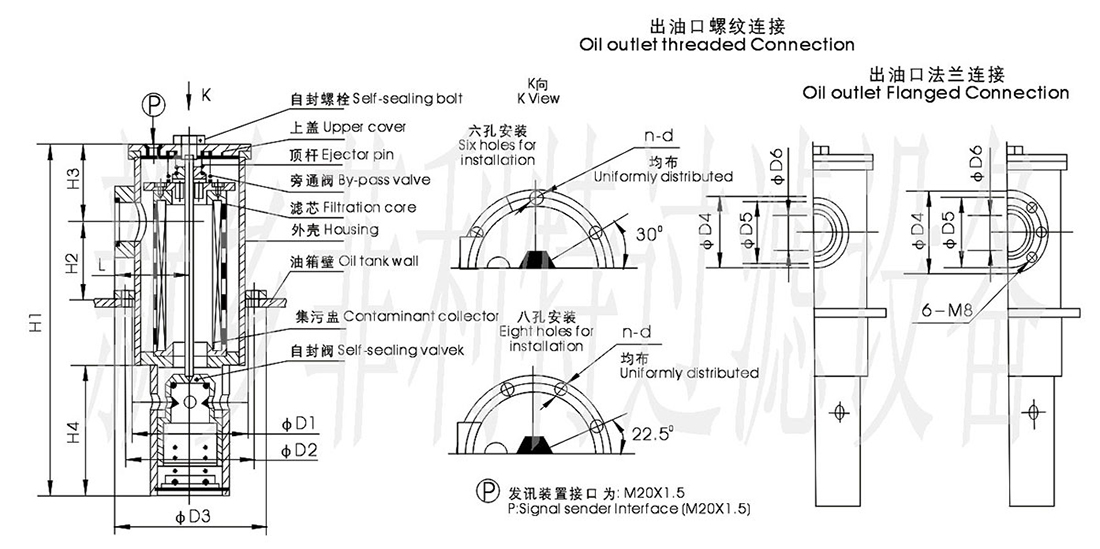 Ø 過濾器可直接安裝在油箱的側(cè)面、底部和上部,筒體伸入油箱的油液中。出油口設(shè)有螺紋和法蘭連接方式,與油泵吸油口連接,管路簡(jiǎn)單,安裝方便。