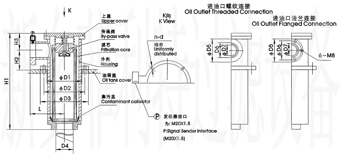 5. 過濾器在工作中,經(jīng)濾芯濾除的污染物集中到設(shè)在濾芯中的集污盅里。當(dāng)更換濾芯時能與濾芯一同帶出,避免已濾除的污染物重新掉進(jìn)油箱。