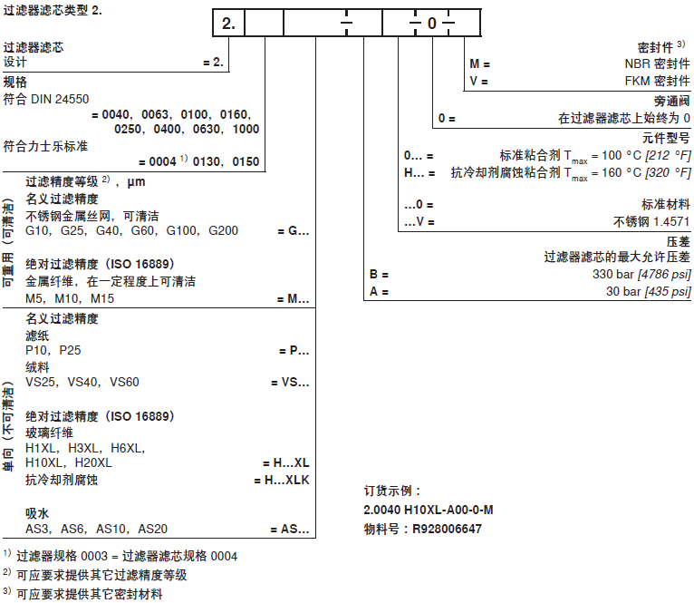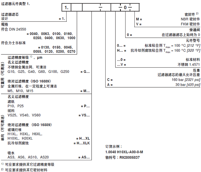 力士樂(lè)Rexroth過(guò)濾器元件類(lèi)型 2.的選型及訂貨號(hào)說(shuō)明: |