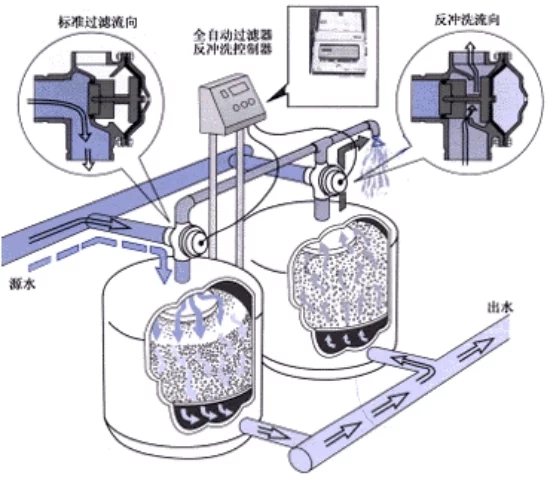 含有懸浮物顆粒的水與絮凝劑充分混合,使水中形成膠體顆粒的雙電層被壓縮。當(dāng)膠體顆粒流過多介質(zhì)過濾器的濾料層時(shí),濾料縫隙對(duì)懸浮物起篩濾作用使懸浮物易于吸附在濾料表面。當(dāng)在濾料表層截留了一定量的污物形成濾膜,隨時(shí)間推移過濾器的前后壓差將會(huì)升高,直至失效。此時(shí)需要利用逆向水流反洗濾料,使過濾器內(nèi)石英砂及無煙煤層懸浮松動(dòng),從而使粘附于石英砂及無煙煤表面的截留物剝離并被水流帶走,恢復(fù)過濾功能。本工程中使用的雙層濾料是在過濾層上部放置較輕的大顆粒無煙煤,下部為大比重的小顆粒石英砂,這樣可以充分發(fā)揮整個(gè)濾層的效率、提高截污能力。