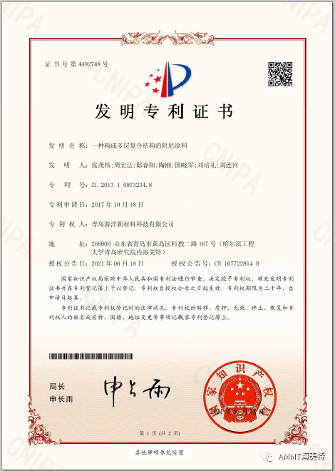 2021年6月18日,青島海洋新材料科技有限公司申請(qǐng)的“一種構(gòu)成多層復(fù)合結(jié)構(gòu)的阻尼涂料”發(fā)明專利獲得國(guó)家知識(shí)產(chǎn)權(quán)局授權(quán),授權(quán)專利號(hào):ZL 2017 1 0973234.8。目前,公司共獲得國(guó)家授權(quán)專利32項(xiàng),其中發(fā)明專利30項(xiàng),實(shí)用新型專利1項(xiàng),外觀設(shè)計(jì)專利1項(xiàng)。