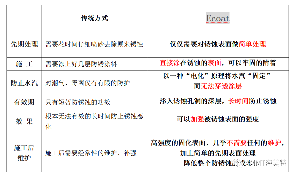 銹蝕對(duì)于許多必須讓設(shè)備曝露在極端的氣候及高濕度環(huán)境中的工業(yè)及產(chǎn)業(yè),是個(gè)巨大的挑戰(zhàn)。一旦使用Ecoat ,可以讓銹蝕情況不再繼續(xù)。在涂上Ecoat后一小時(shí)內(nèi),它就開始結(jié)合空氣中的水汽而固化,同時(shí)滲入因銹蝕所產(chǎn)生的微小細(xì)孔中,膨脹、 硬化、密封。這個(gè)過(guò)程把表面,包括銹蝕部分完全密封,讓外面的水汽、空氣還有一些礦物成分沒(méi)有任何機(jī)會(huì)再度接觸到表面,繼續(xù)銹蝕。