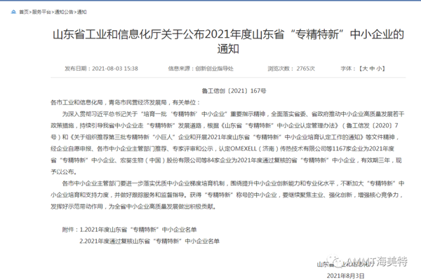 2021年8月,青島海洋新材料科技有限公司(AMMT海美特)獲批2021年度山東省“專精特新”中小企業(yè)榮譽(yù)稱號!