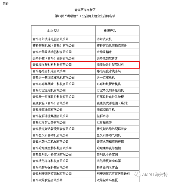青島海洋新材料以自主研發(fā)的“海美特改性聚脲材料”申報青島西海岸新區(qū)第四批“瑯琊榜”工業(yè)品牌評選活動,經過層層評選,榮獲“瑯琊榜”工業(yè)品牌企業(yè)榮譽稱號。此榮譽的獲得,是對海美特企業(yè)實力和產品技術的肯定。