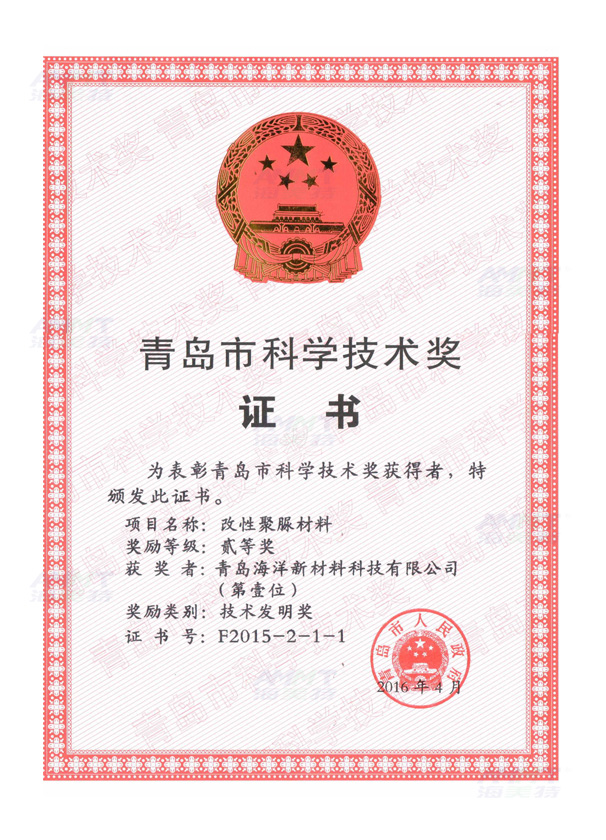 青島市科學(xué)技術(shù)獎二等獎(聚脲)